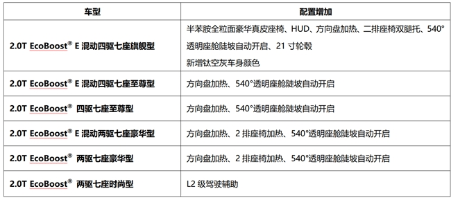 福特锐界L全面提升大家庭出行价值,并以“同级唯一具备2-2-3和2-3-2座椅布局可选”、“二排独立悬浮式座椅,一键安心舒躺,独立加热、通风的二排头等舱体验”和“同级唯一中配起即享二排座椅加热和方向盘加热”的超期待产品体验,为现代家庭用户打造更高级、更豪华、更舒适的“全家安心出游神器”。